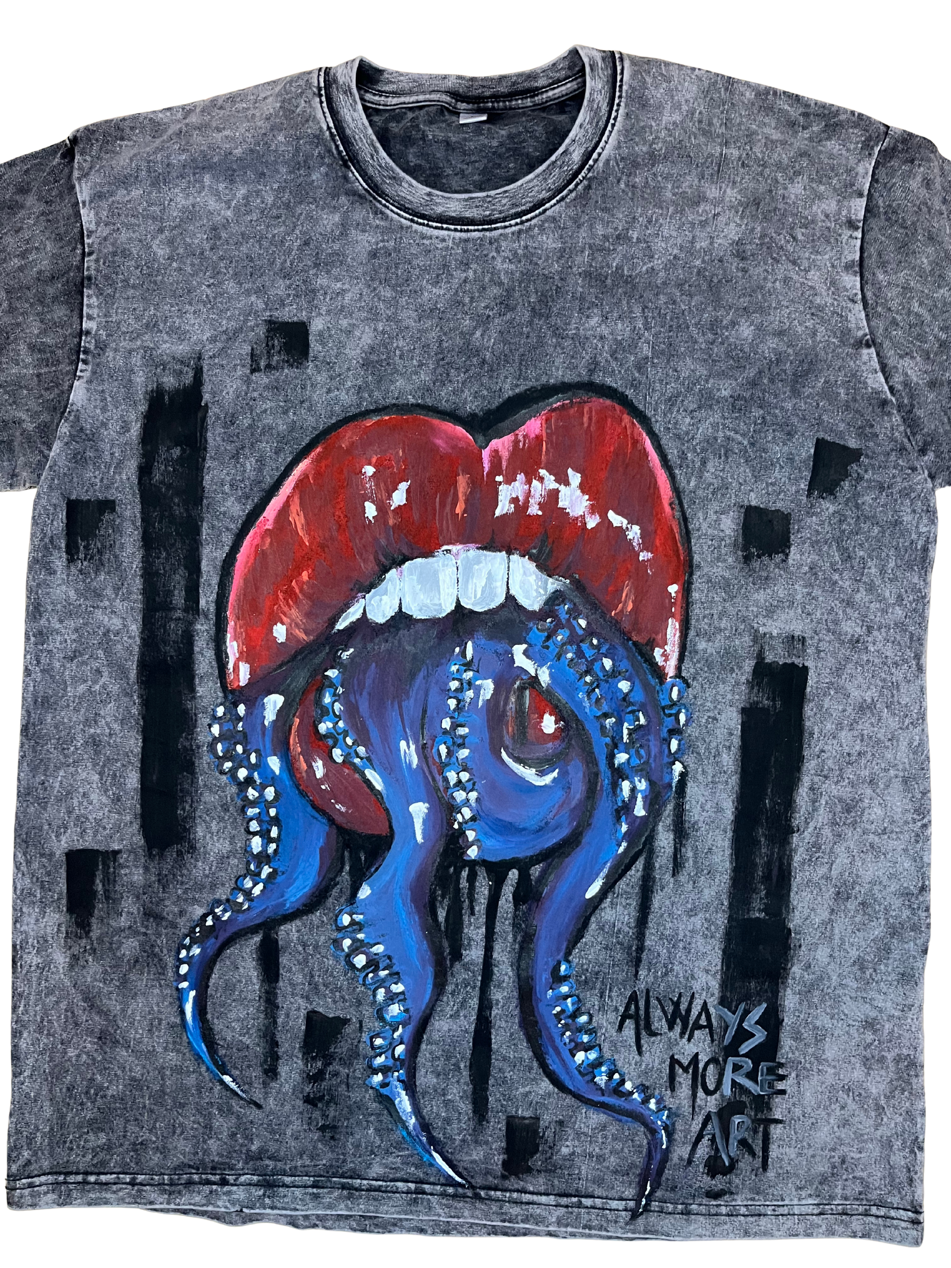A one‑of‑a‑kind, hand‑painted piece in size L. On the fabric, full, fleshy lips open like a living portal, releasing flowing octopus tentacles that extend with both strength and elegance. The artwork blends sensuality and oceanic mystery, merging body and sea in a single visual gesture. Every brushstroke preserves its texture and spontaneity, making this garment truly unrepeatable.